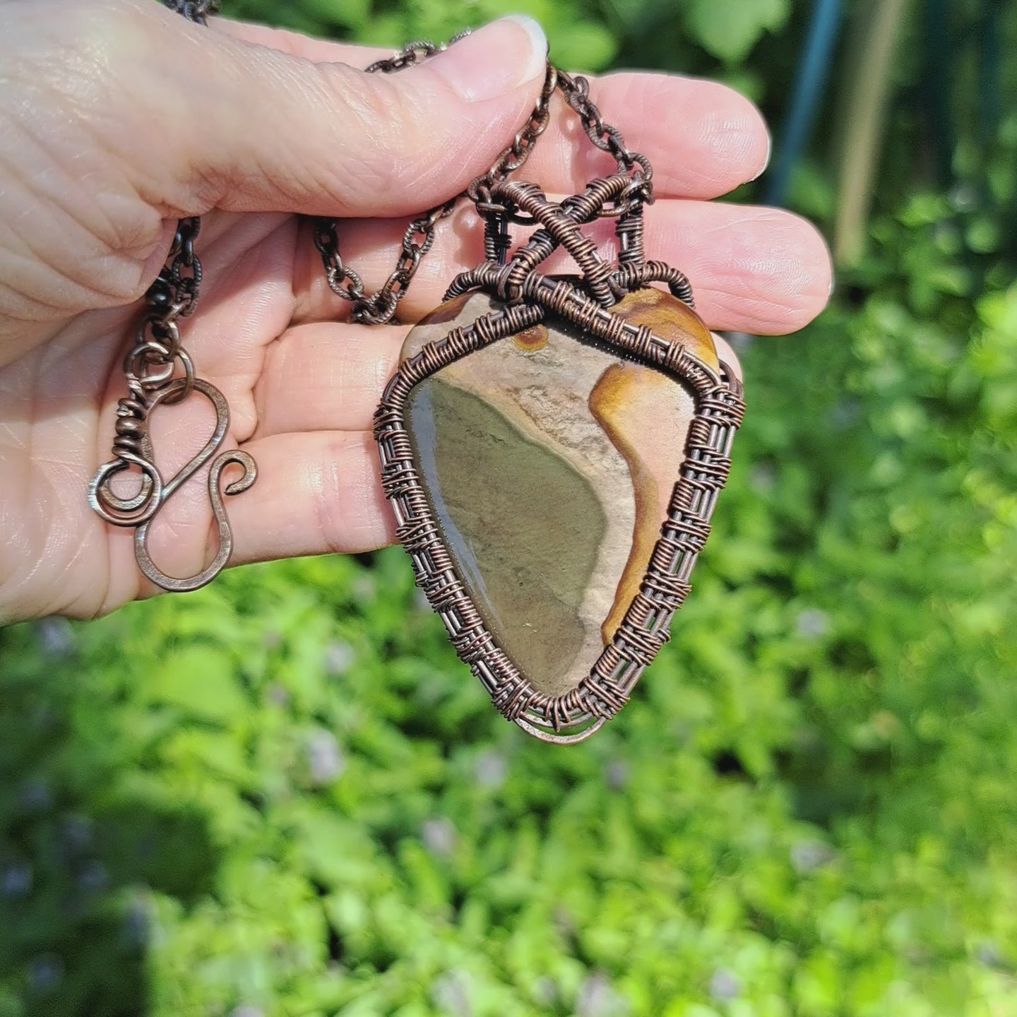 - Chain: oxidized 3.4mm copper and closes with a handcrafted s-hook clasp.
